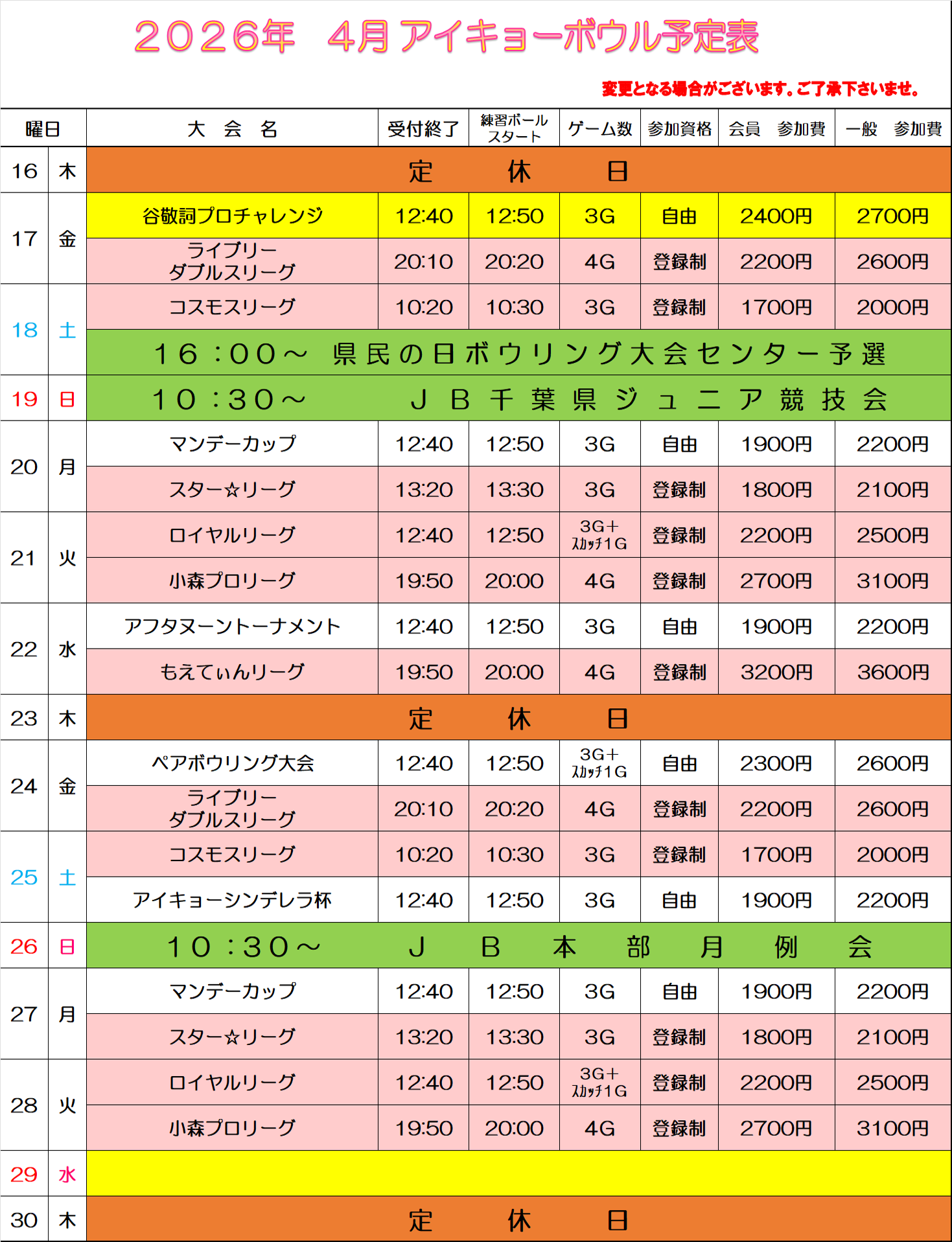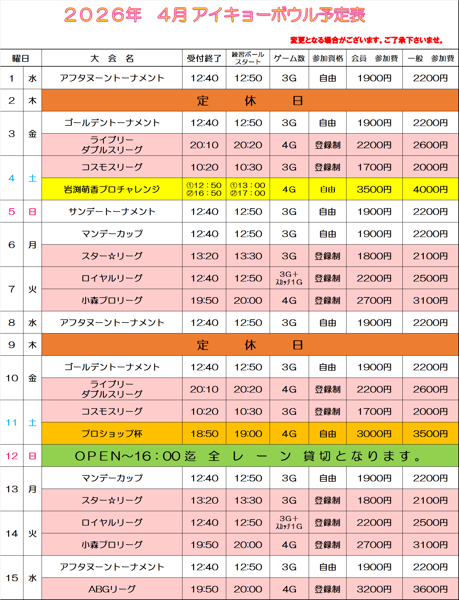 2026年4月アイキョーボウル予定表